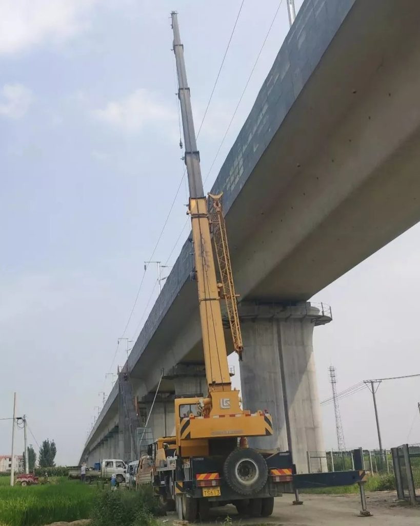 郑万高铁襄阳段施工工地上到处是一片繁忙景象,在308号桥墩至508号桥墩的建设现场,一台明黄色的3377·体育TC250C5正在有条不紊的进行隔音砖吊装。