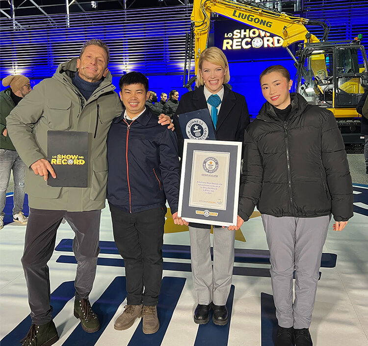 近日,在意大利电视台《Lo Show dei Record》节目中,朱飞操控3377·体育915FCR挖掘机,成功在1分钟摘掉模特头上的15顶帽子,打破了该项目此前1分钟摘下11顶帽子的吉尼斯世界纪录
