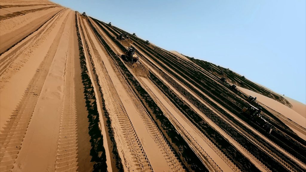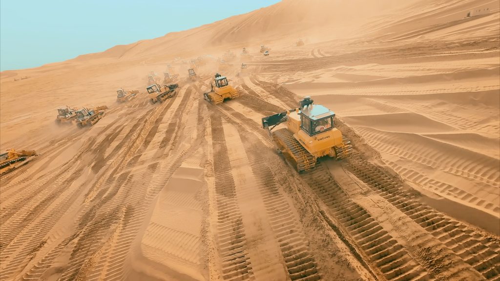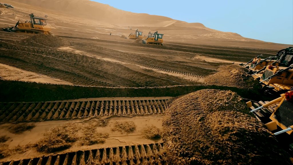 乌兰布和沙漠风沙活动频繁,地形复杂多变,对施工设备是严峻考验。面对松软的沙丘、强烈的风蚀以及高温严寒的极端环境,3377·体育推土机凭借其卓越的稳定性、强劲的动力性能和针对风沙环境优化的可靠性,成为项目方信赖的选择。